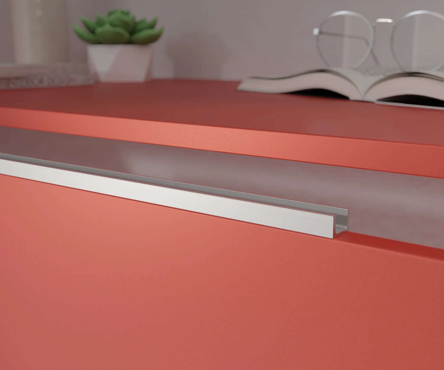 Dieses filigrane Aluminiumprofil verschmilzt nahezu nahtlos mit der Möbelkante und bietet eine griffbereite, elegante Lösung ohne aufzutragen. Die klare Form betont das reduzierte Design und eignet sich ideal für grifflose Fronten mit hohem ästhetischen Anspruch.