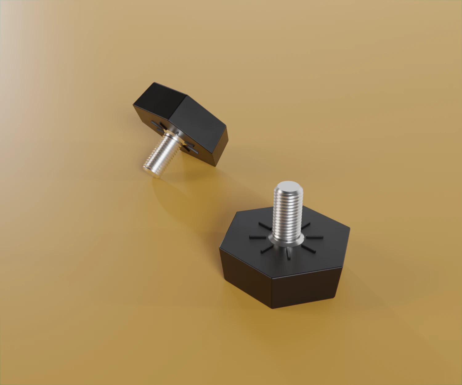 Robuster Nivellierfuß mit sechskantförmigem Kunststoffkörper und integrierter Edelstahl-Gewindestange. Die rutschfeste Struktur am Ansatz bietet festen Halt im Profil – ideal für exakte Höhenanpassung und stabilen Stand.