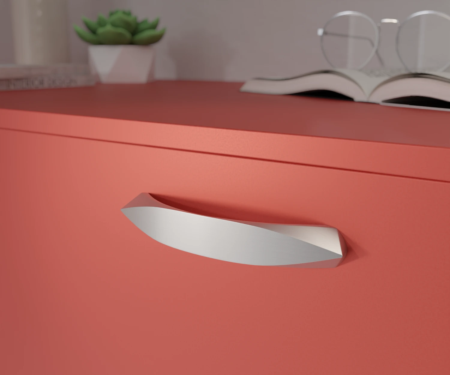 Dieser Griff besticht durch seine außergewöhnliche Form mit klaren Kanten, fließenden Linien und einer fast skulpturalen Anmutung. Die leicht asymmetrische Silhouette erinnert an modernes Industriedesign und verleiht jedem Möbelstück einen avantgardistischen Charakter. Ideal für exklusive Küchen oder Designmöbel mit Anspruch.