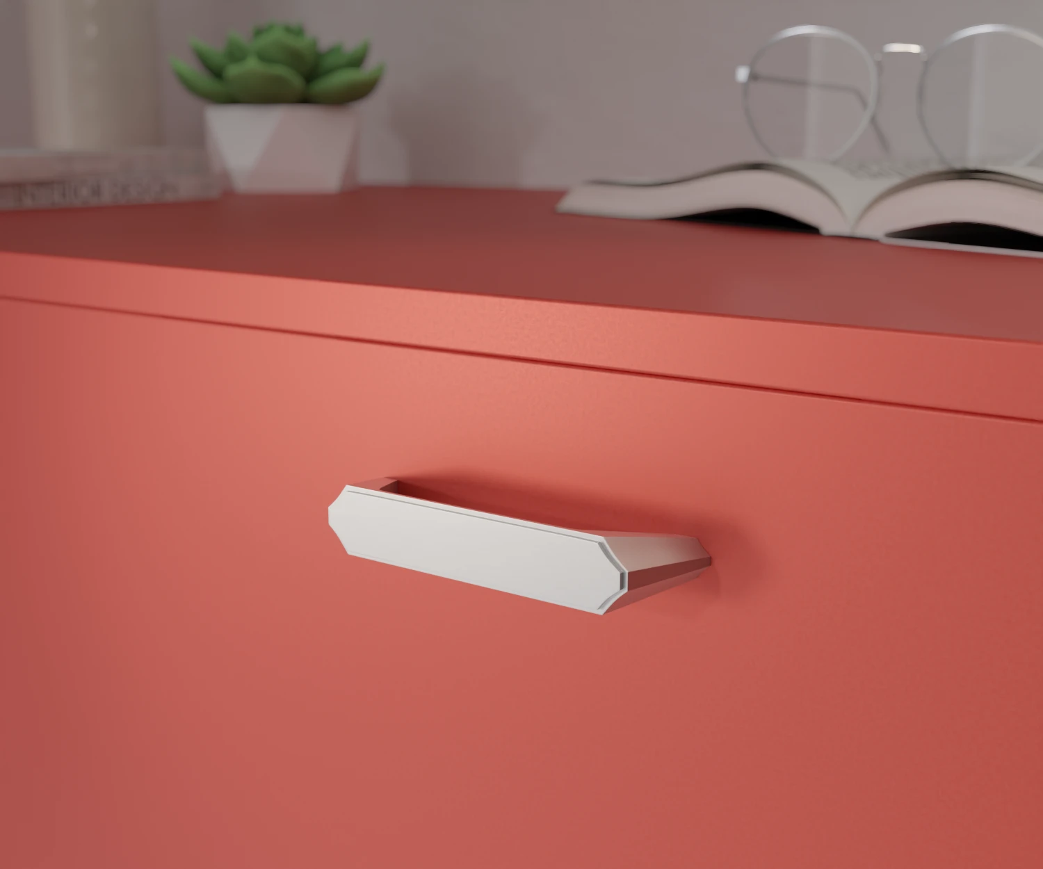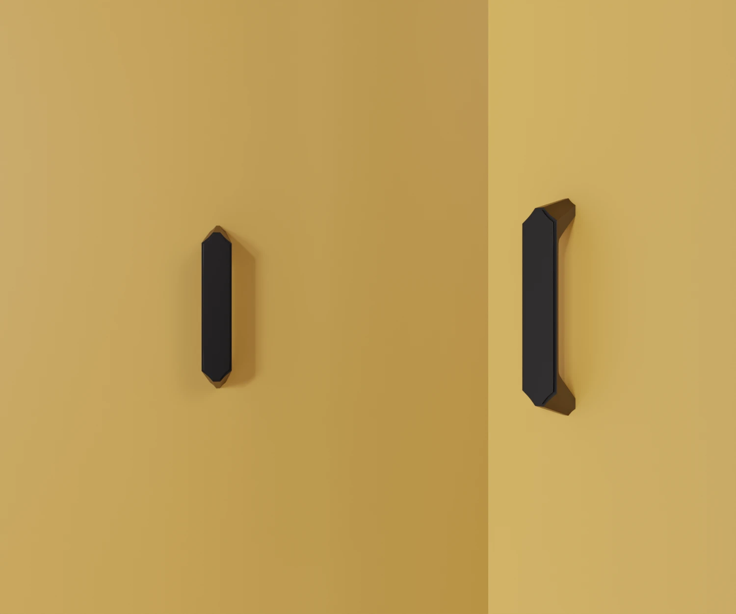Dieser Griff vereint funktionale Eleganz mit geometrischer Raffinesse. Die geschwungen-kantige Form erinnert an architektonische Profile und setzt klare Akzente auf Schubladen und Möbelfronten. Ideal für stilbewusste Innenräume, die klassische Formen mit modernen Materialien kombinieren.