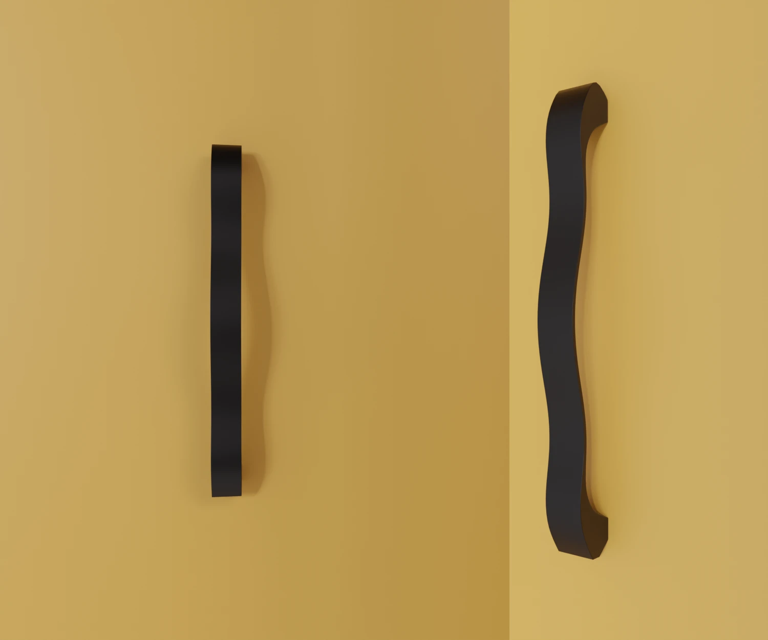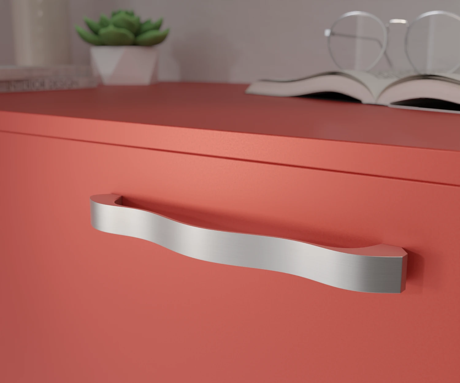 Dieser Griff bringt mit seinen markanten Wellen eine frische Dynamik in jedes Möbelstück. Die weiche Linienführung erzeugt ein lebendiges Spiel von Licht und Schatten – perfekt für alle, die klassische Eleganz mit einem Hauch Extravaganz kombinieren möchten.
