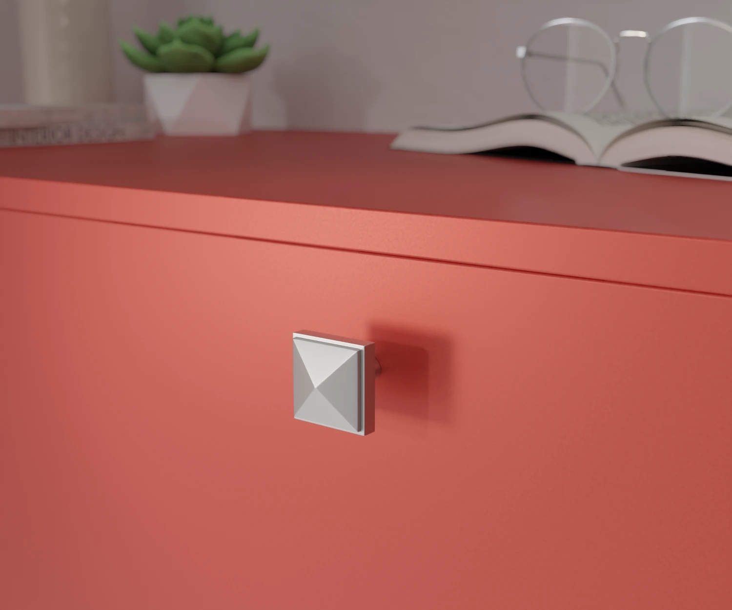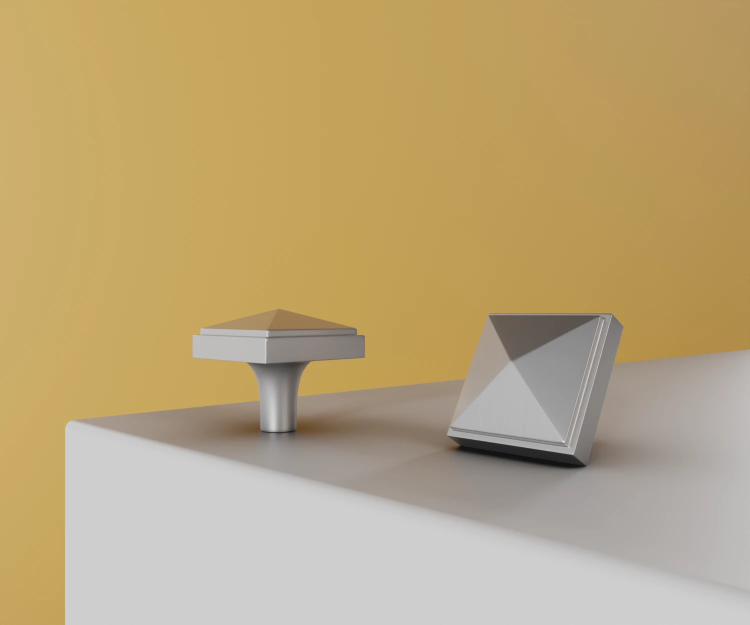 Mit seiner pyramidenförmigen Front setzt dieser quadratische Knopfgriff ein kraftvolles Statement. Die geschliffene Oberfläche betont die Geometrie und verleiht dem Griff eine edle, fast skulpturale Anmutung – ideal für stilvolle Akzente an Möbeln mit klarer Formensprache.